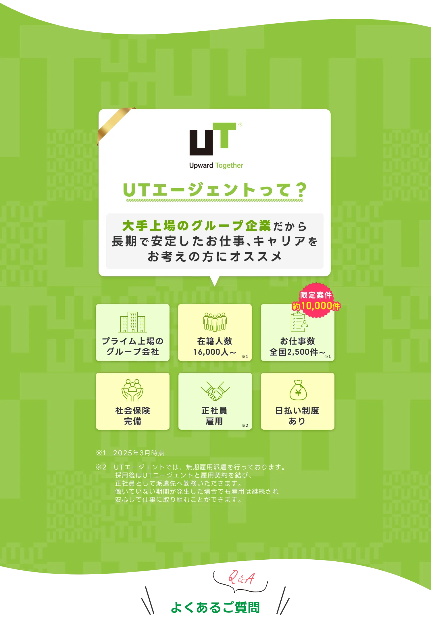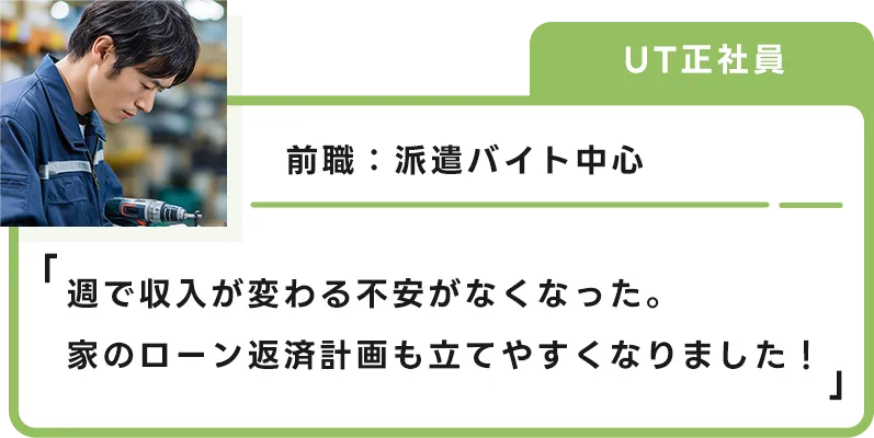 UTエージェントの「無期雇用派遣」は期間の定めがありません。採用後はUTエージェントと雇用契約を結び、UTエージェントの正社員として、派遣先で勤務いただきます。