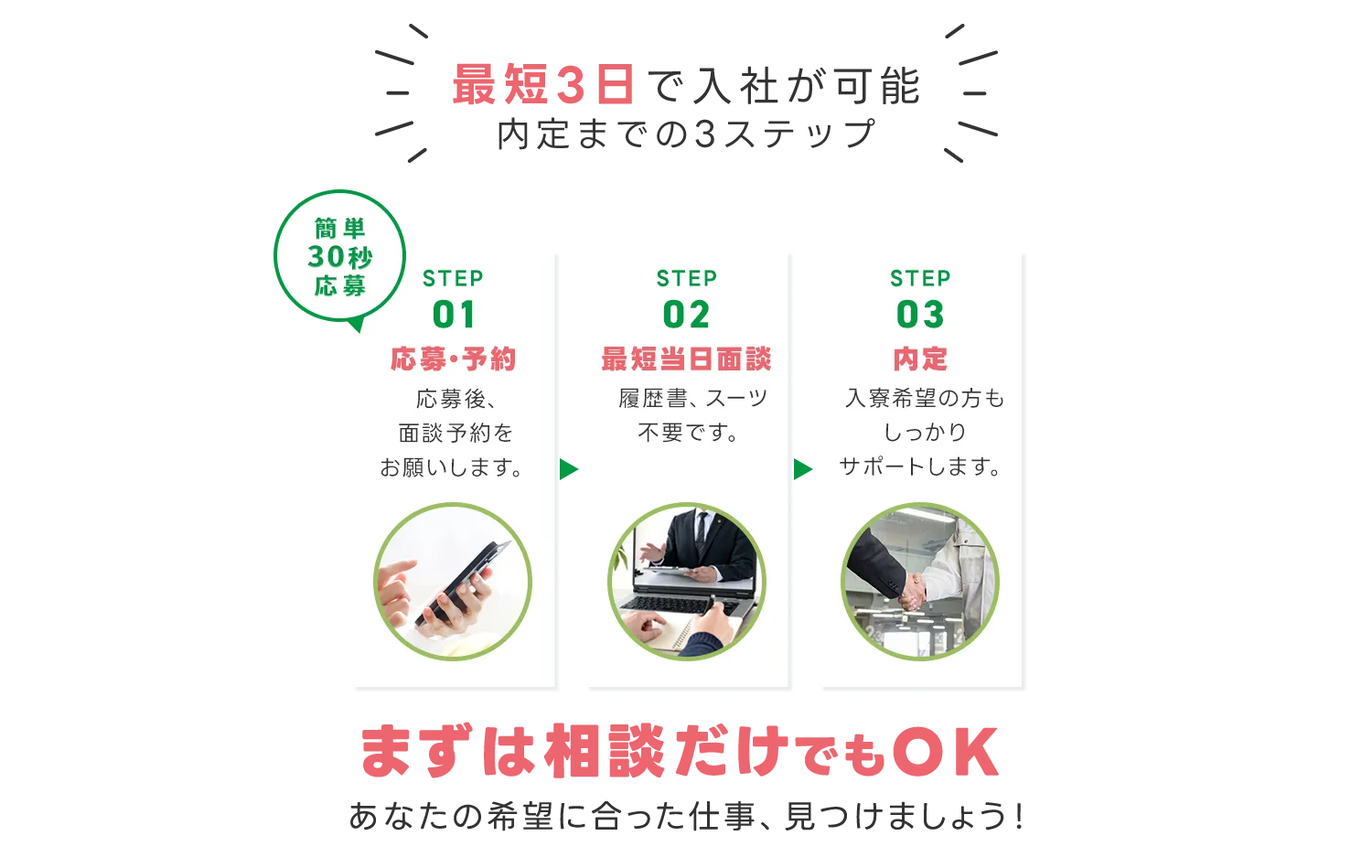 お時間を頂く場合がありますが、すぐに働きたい方は面接時にご相談ください。