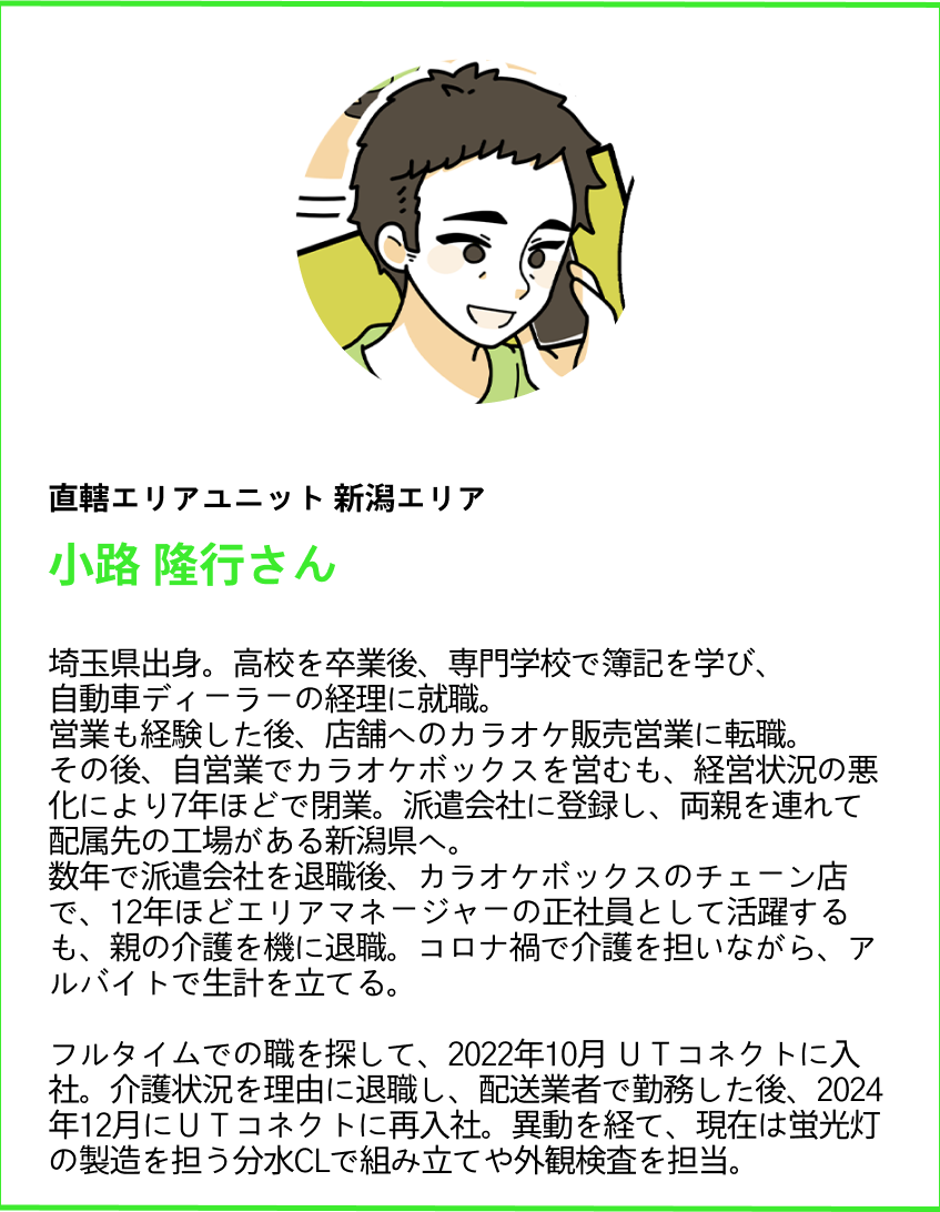 今回ご紹介するのは、2024年にUTコネクト(現在、UTエージェント)に再入社された、小路 隆行さん。家族の介護に直面する人が多い世代でもある50代で、仕事と介護の両立を目指しながら、再入社や職場異動の仕組みを活用して、自分の働き方を模索されてきました。介護が始まったきっかけやリアルな生活、再入社や異動を実現した背景など、小路さんのお話を聞いてきました。
