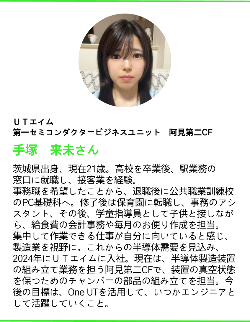 A.私がいる工程では周りに約10名の方がいて、男性と女性の比率はだいたい半々。女性は20代、40代、50代の方々が働き、私と同じく20代もいれば、小さいお子さんを育てながら働いている方、ご年配の方も活躍されている環境です。阿見第二CF全体で見ても女性の比率は多め。9月には3名のUT社員の女性が、Next UTを活用してお客様先の正社員に転籍されました。