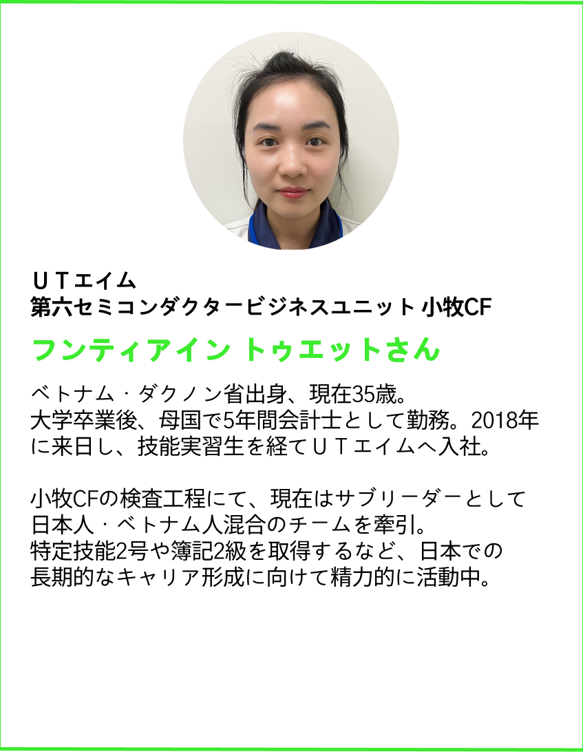 空調完備の綺麗な室内で、常時日勤のみの勤務体系のため、体への負担が少なく安定して働けます。産休や時短勤務などライフステージに合わせた働き方が可能で、女性比率が約68%と高いのも特徴です。各工程にリーダーがいるほか、事務所にはUTの管理者が常駐しており、業務やキャリアについていつでも気軽に相談できるバックアップ体制が整っています。また、髪色や長さが自由な点も魅力の一つです。